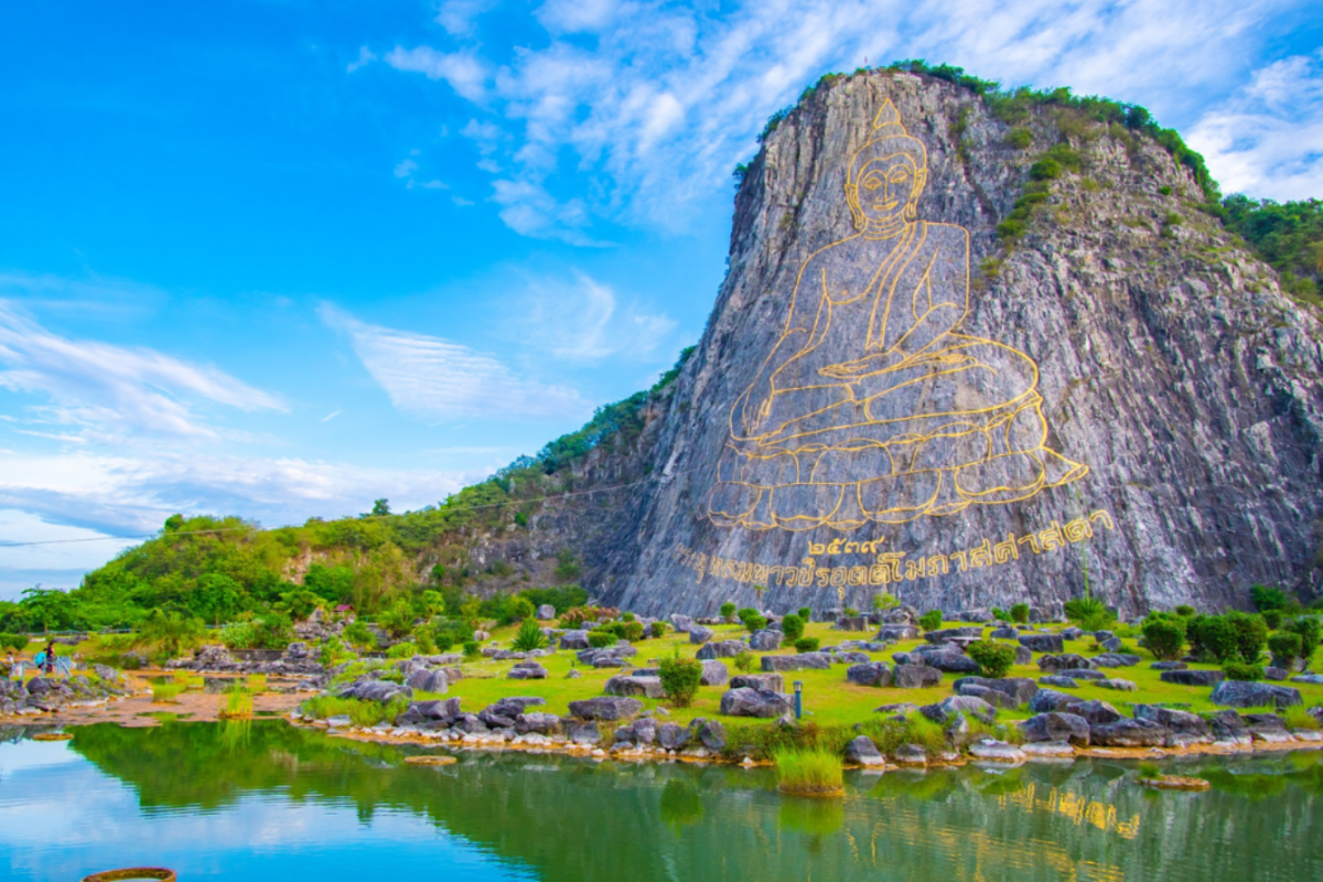 - Tiếp tục tham quan “Trân Bảo Phật Sơn” hay còn gọi là Khao Chee Chan, nơi được tạo nên nhân dịp kỷ niệm 50 năm đăng cơ của nhà vua Thái Lan. Là một ngọn núi đẹp nổi tiếng nằm ở tỉnh Chon Buri, cách Pattaya – thiên đường biển đảo Thái Lan chỉ khoảng 15 km. Bức tượng cao đến hơn 100 mét, rộng khoảng 70 mét, được đúc nổi hoàn toàn bằng vàng ròng 24 cara, được tiến hành xây dựng vào năm 1996 nhân dịp Quốc vương Rama IX trị vì vương quốc Thái Lan được 50 năm.