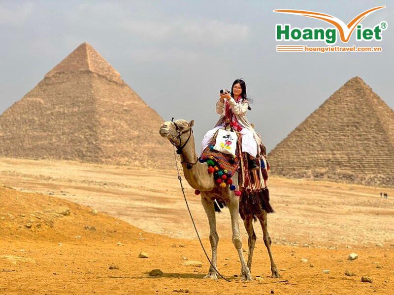 Điểm nhấn đặc biệt: Trải nghiệm cưỡi lạc đà tại chân Kim Tự Tháp – một khoảnh khắc “để đời” giữa khung cảnh kỳ vĩ của Giza. Những bước chân chậm rãi của lạc đà trên cát, những bức hình ngược sáng với nền kim tự tháp sừng sững phía sau… sẽ là kỷ niệm không thể nào quên.