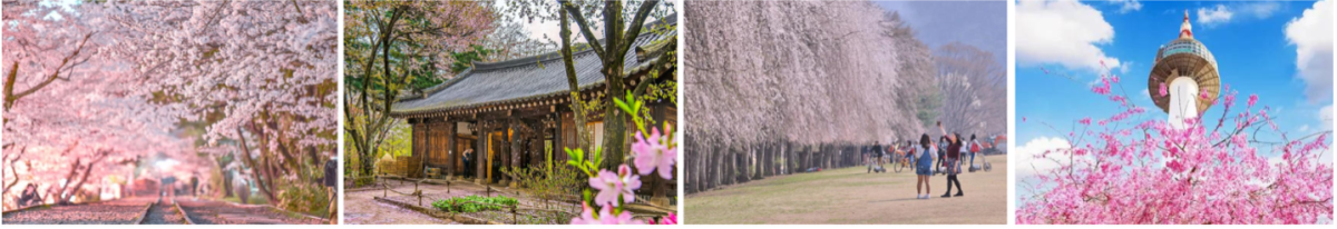• Thưởng ngoạn và chụp ảnh trên con đường hoa anh đào nổi tiếng nhất Seoul, Công viên Yeouido đường Yunjungno phía sau tòa nhà Quốc Hội-điểm ngắm hoa anh đòa nổi tiếng nhất ở Seoul, được viền bằng 1.400 cây hoa anh đào nở đầy những bông hoa màu hồng nhạt.