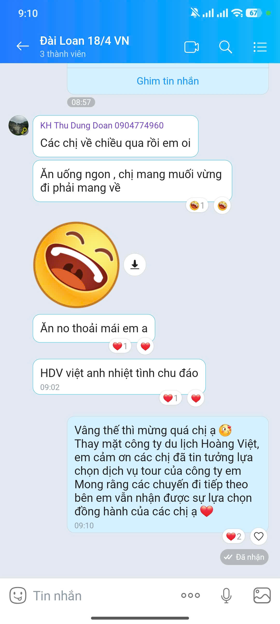 Chuyến du lịch ĐÀI LOAN 08-12/4 đã thực hiện được mục tiêu của đoàn và mỗi thành viên. Xin trân trọng cảm ơn Công ty Du Lịch Đầu tư -Vận tải - Du lịch Hoàng Việt, Công ty Du lịch Taiwan nói chung, cùng Hdv Dương, Thương. Chúc hai Công ty, hdv Dương, Thương cùng các thành viên của đoàn luôn vui khoẻ, mọi sự luôn tốt lành và vạn sự như ý. Tuấn Xuân