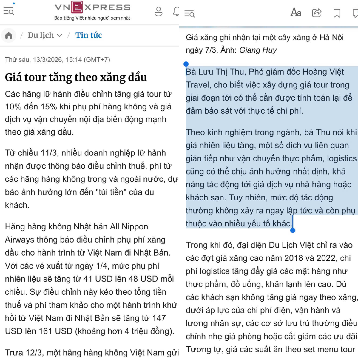 NGÀY 13/3/2026, TRÊN BÀI BÁO VNEXPRESS VIẾT VỀ " GIÁ TOUR TĂNG THEO XĂNG DẦU", BÀ LƯU THỊ THU - PHÓ GIÁM ĐỐC CÔNG TY DU LỊCH HOÀNG VIỆT CHO BIẾT: GIÁ TOUR DU LỊCH ĐANG TĂNG KHOẢNG 10–15% DO TÁC ĐỘNG TRỰC TIẾP TỪ VIỆC GIÁ XĂNG DẦU LEO THANG, KÉO THEO CHI PHÍ VẬN CHUYỂN VÀ HÀNG KHÔNG ĐỒNG LOẠT TĂNG, KHIẾN DOANH NGHIỆP LỮ HÀNH GẶP NHIỀU KHÓ KHĂN TRONG VIỆC GIỮ GIÁ ỔN ĐỊNH, ĐẶC BIỆT KHI KHÔNG THỂ DỰ ĐOÁN BIẾN ĐỘNG DÀI HẠN. CÁC DOANH NGHIỆP BUỘC PHẢI TÍNH TOÁN LẠI GIÁ TOUR ĐỂ PHẢN ÁNH SÁT CHI PHÍ THỰC TẾ, BỞI ẢNH HƯỞNG CỦA XĂNG DẦU KHÔNG CHỈ DỪNG Ở VẬN CHUYỂN MÀ CÒN LAN SANG CÁC CHI PHÍ GIÁN TIẾP NHƯ LOGISTICS VÀ VẬN CHUYỂN HÀNG HÓA. TUY NHIÊN, BÀ CŨNG CHO RẰNG TÁC ĐỘNG NÀY CHƯA ẢNH HƯỞNG NGAY LẬP TỨC ĐẾN GIÁ DỊCH VỤ NHƯ NHÀ HÀNG, KHÁCH SẠN MÀ CÒN PHỤ THUỘC VÀO NHIỀU YẾU TỐ KHÁC, CHO THẤY ÁP LỰC CHI PHÍ TRONG NGÀNH DU LỊCH MANG TÍNH DÂY CHUYỀN NHƯNG CÓ ĐỘ TRỄ NHẤT ĐỊNH.