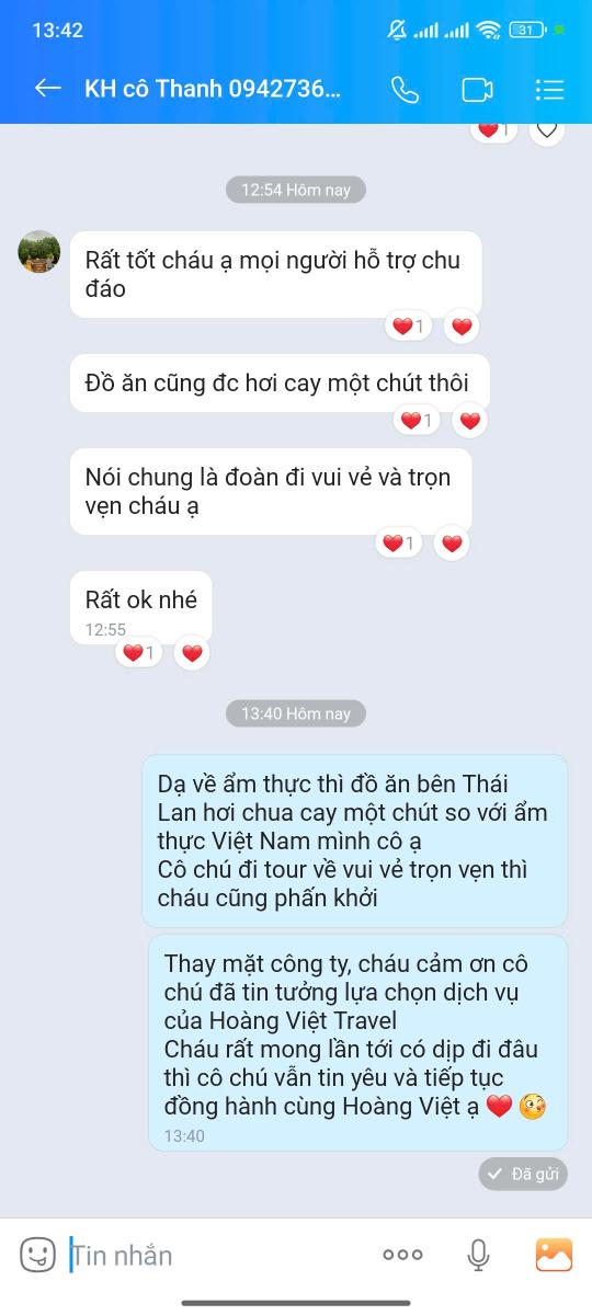 Đoàn chú Quỳnh Anh đi Thái Lan đã về VN đúng kế hoạch. Đại diện đoàn đánh giá như sau: các điểm tham quan được thực hiện nghiêm túc, hướng dẫn viên nhiệt tình vui vẻ, đã hỗ trợ đoàn khi có yêu cầu, khi đi tại sân bay Nội Bài một thành viên trong đoàn làm rớt ví đã được hướng dẫn viên hỗ trợ tìm thấy kịp thời. Ngoài chương trình khi đoàn có nguyện vọng mua sắm, tìm hiểu thêm về đất nước con người Thái Lan đều được hỗ trợ trong điều kiện cho phép. Thay mặt anh em trong đoàn đánh giá chuyến đi thành công tốt đẹp.